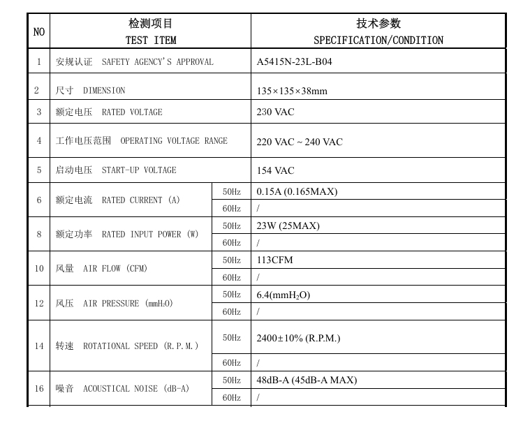 企业首页    风机风扇    AC 风扇    135x135x38mm    A5415N-23L-B04【13538风扇】230VAC 0.15A 2400RPM 交流风扇