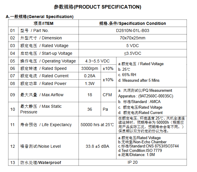 企业首页    风机风扇    DC 风扇    70x70x25mm    D2810N-01L-B03【7025风扇】5VDC 0.28A 3300RPM 直流风扇